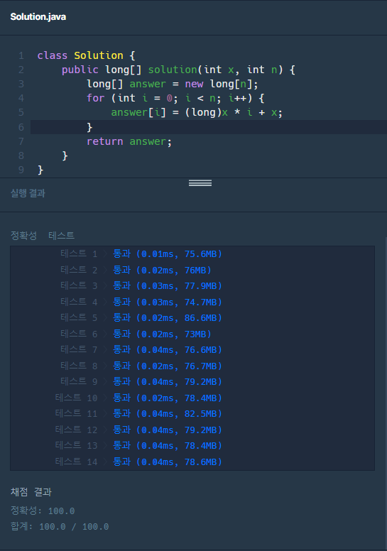 다시 위로 올라가 테스트를 실패한 코드를 보면 answer[i] = (long)x + x * i; 부분에서 x * i의 연산이 먼저 수행되기 때문에 x는 int형으로 지정되어 처리되는 것을 알 수 있다.